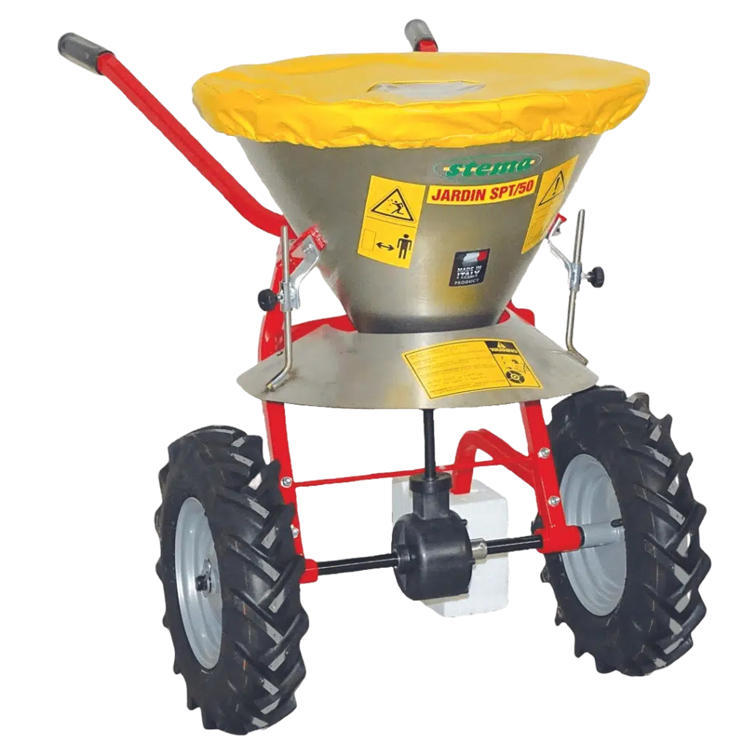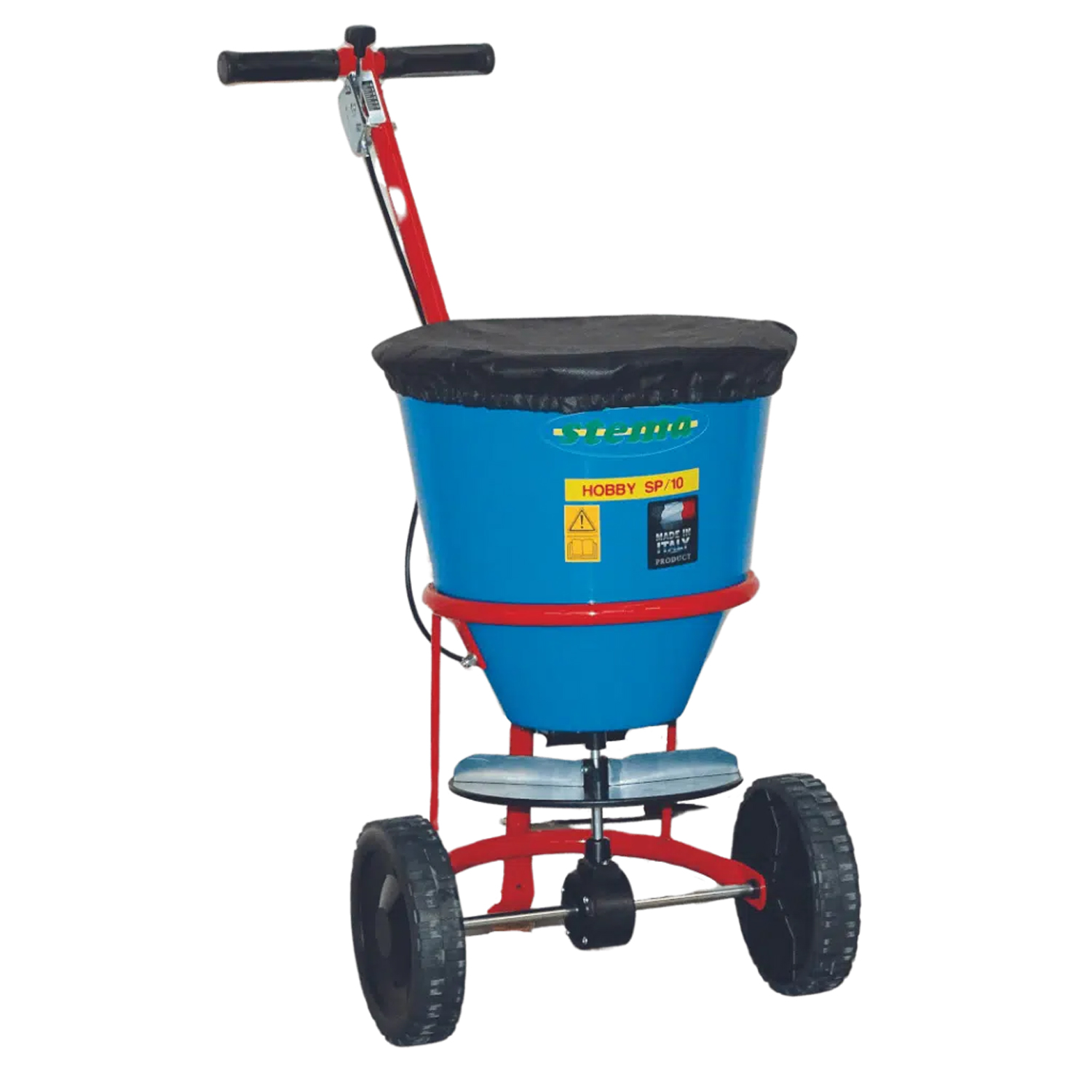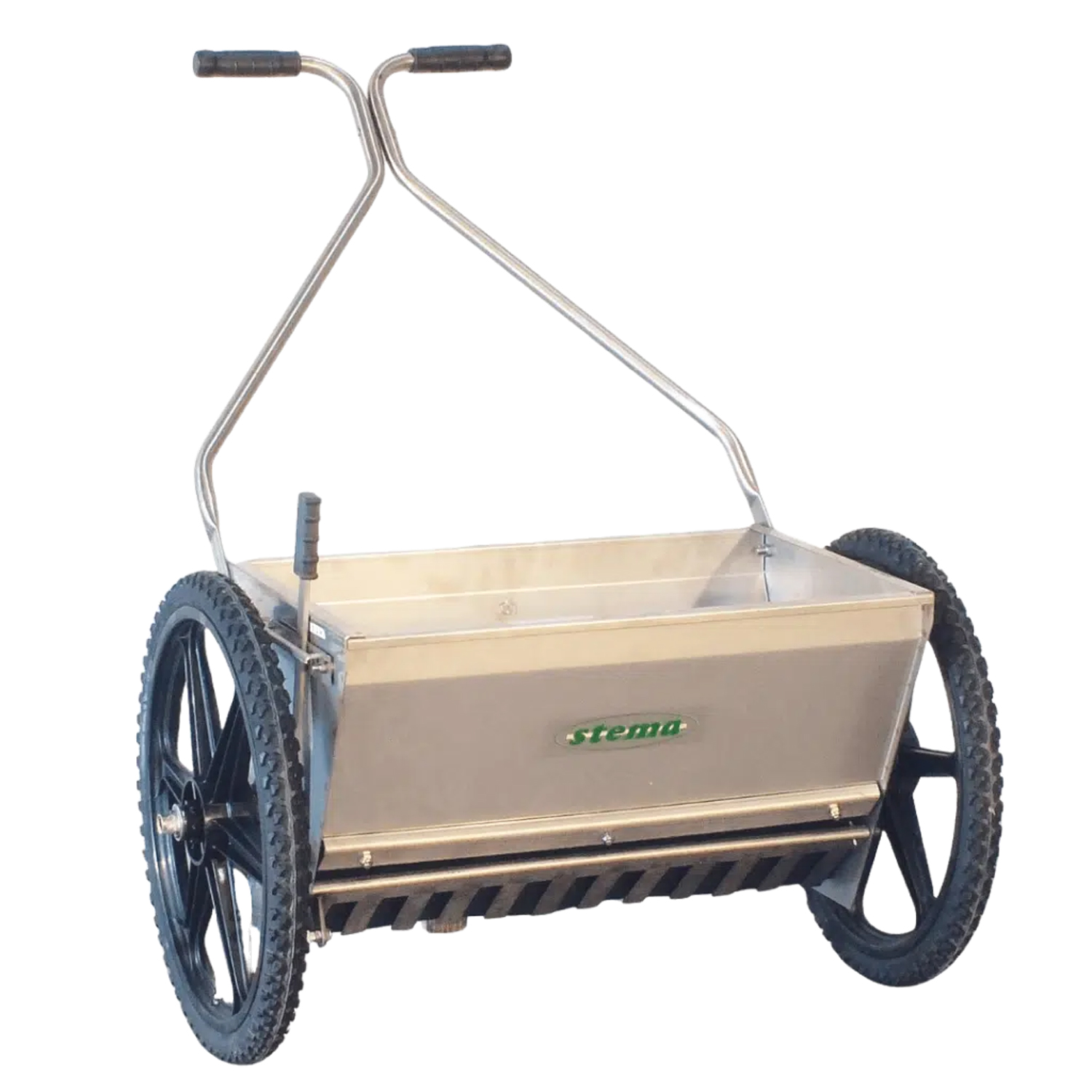 Robuster Scheibenstreuer mit Trichter aus rostfreiem Inox für grössere Flächen mit Abdeckplane.